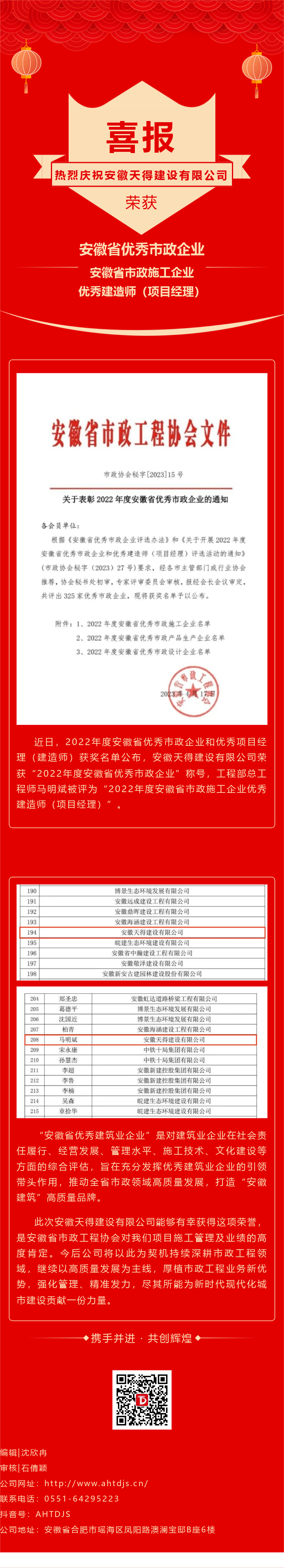 喜報!熱烈慶賀安徽天得建設有限公司榮獲安徽省優秀市政企業、安徽省市政施工企業優秀建造師(項目經理)