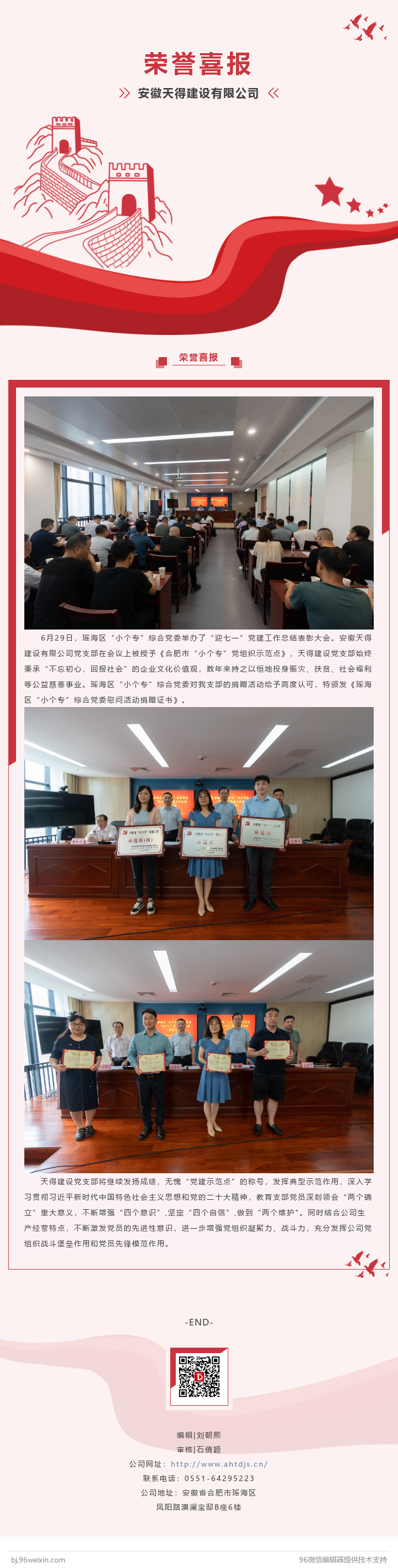 喜報!恭喜天得建設獲得《合肥市“小個專”黨組織示范點》稱號、《瑤海區“小個專”綜合黨委慰問活動捐贈證書》。